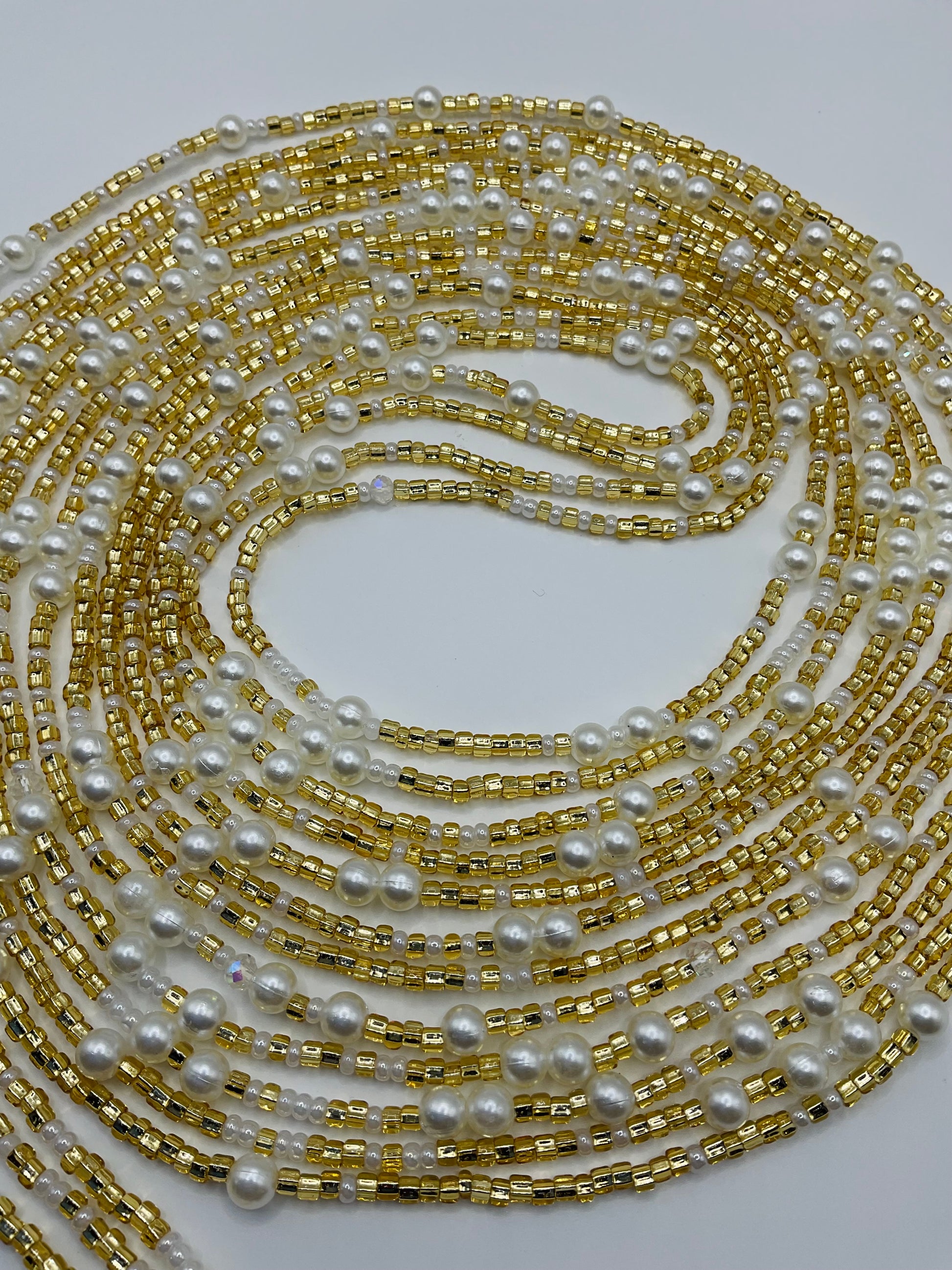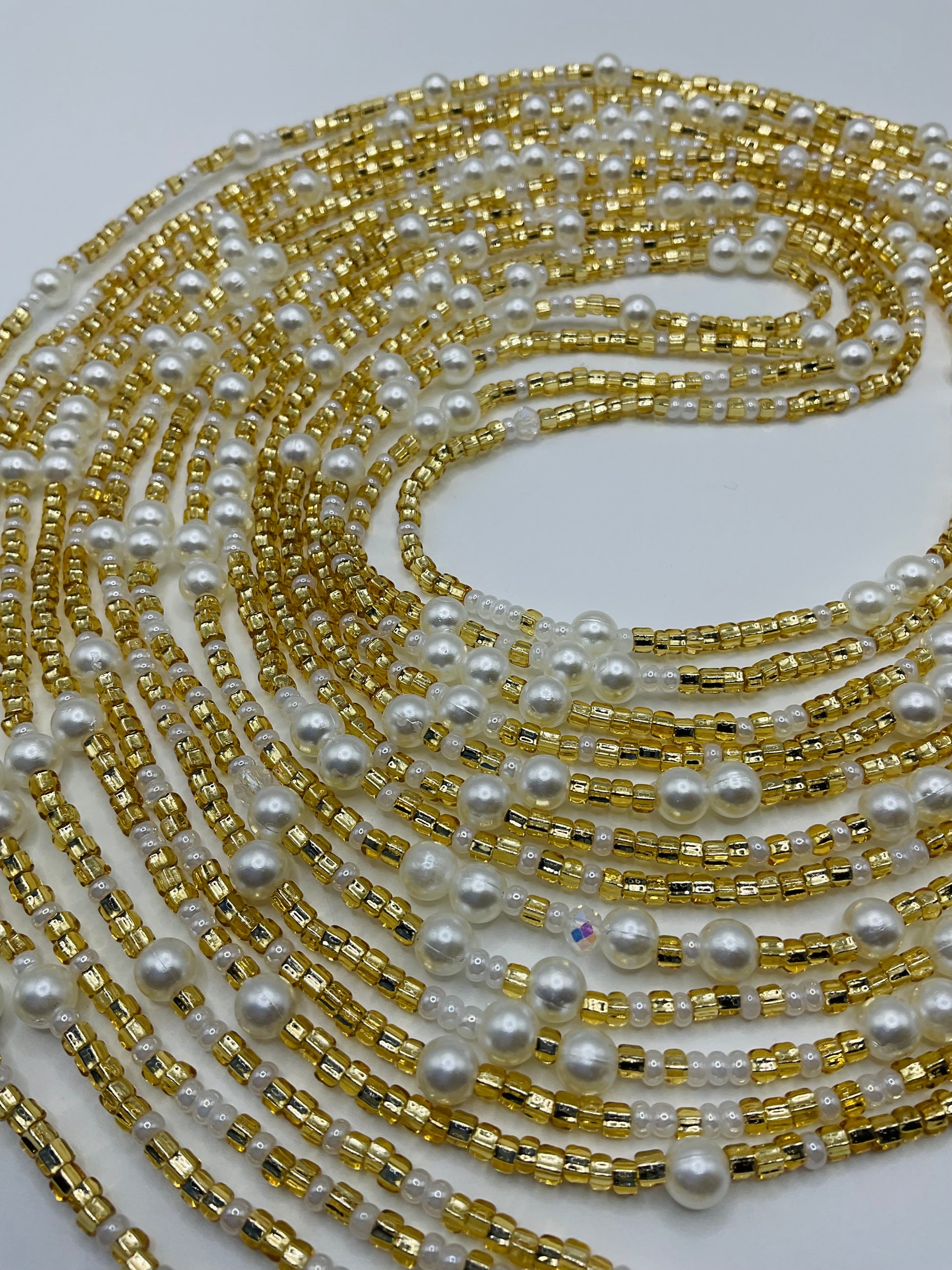 Crafted with care and precision, these Golden pearl Waistbeads are 60 inches in length and serve as a stunning adornment to enhance your natural beauty.